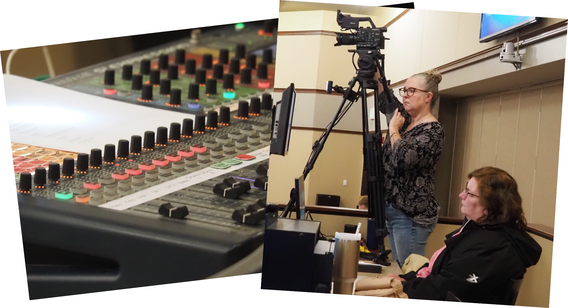 The tech team manages the sound board, lights, slides, and video during the services; creates graphics and videos for church ministries and services; and designs and maintains the church website and social media.